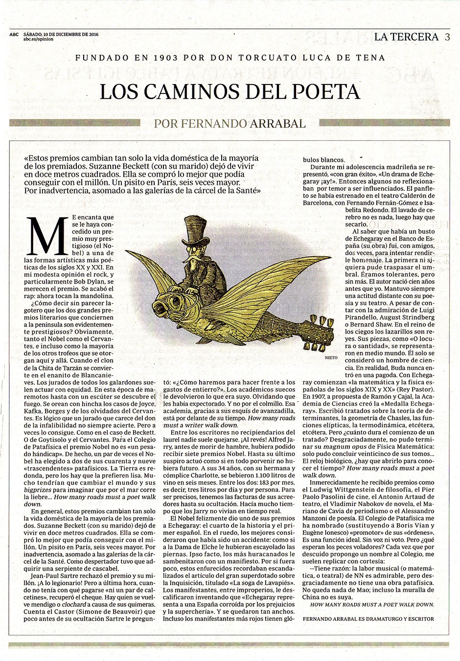 ¿Cómo decir sin parecer lagotero, que los dos grandes premios literarios que conciernen a la península son evidentemente prestigiosos? Obviamente tanto el Nobel como el Cervantes. E incluso como la mayoría de los otros trofeos que se otorgan aquí y allá. Cuando el clon de la Chita de Tarzán se convierte en el enanito de Blancanieves. Los jurados de todos los galardones suelen actuar con equidad. En esta época de maremotos hasta con un escúter se descubre el fuego. Se orean con hincha los casos de Joyce, Kafka, Borges y de los olvidados del Cervantes. Es lógico que un jurado que carece del don de infalibilidad no siempre acierte. Pero a veces lo consigue. Como en el caso de Beckett. O de Goytisolo y el Cervantes. Para el Colegio de Patafîsica el premio Nobel no es “un pesado hándicap”. De hecho un par de veces Nobel ha elegido a dos de sus cuarenta y nueve “trascendentes” patafísicos. La tierra es redonda pero los hay que la prefieren lisa. Mucho tendría que cambiar el mundo y sus “big prizes” para imaginar que por el mar corre la liebre… How many roads must a poet walk down.
