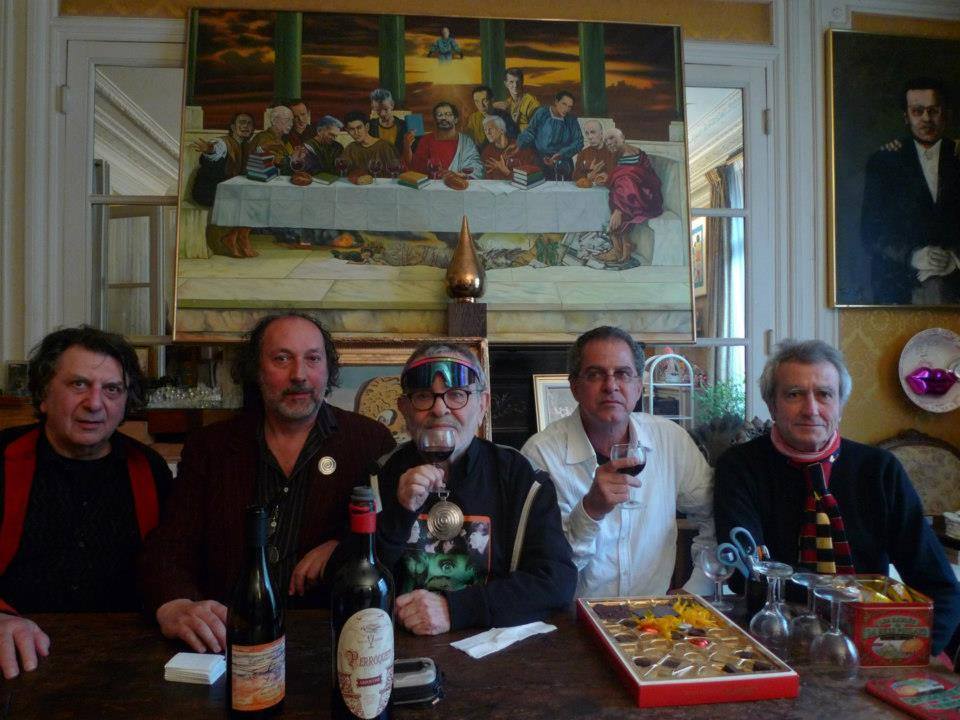 Foto: Thieri Foulc (escritor francês e Régistrateur de l’Ordre do Collège de Pataphysique), Fulvio Abbate (escritor, cineasta e crítico de arte italiano), Fernando Arrabal (dramaturgo e poeta espanhol), Wilson Coêlho (dramaturgo e escritor brasileiro) e Diego Bardón (toreiro pânico espanhol) entre um vinho e outro no almoço com Arrabal aos 03-02-2013, em Paris. — com Thieri Foulc, Fulvio Abbate, Fernando Arrabal e Diego Bardón.
