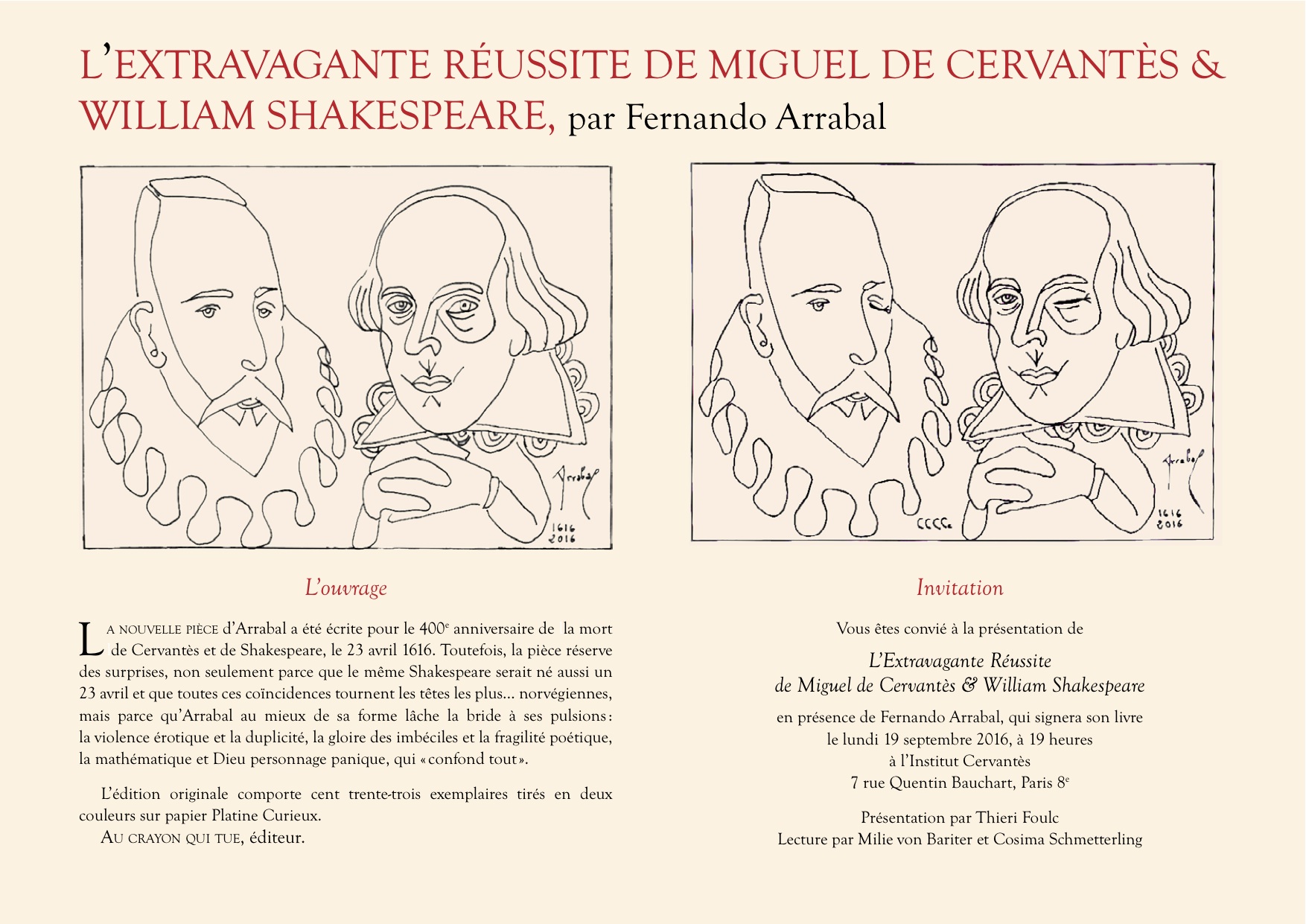 3. Diego Moldes.- Cette année tu as publié « L’extravagante réussite de Miguel de Cervantès et William Shakespeare « (Au crayon qui tue), le roman « El circunspecto » (Reino de Cordelia), « El Extravagante triunfo de Miguel de Cerbantes [avec b] y William Shakespeare » (Libros del Innombrable) et « Credo quia confusum » (ta ‘poesía reunida’ en Huerga & Fierro). Que peux-tu dire au public pour qu’il lise ces deux livres ?