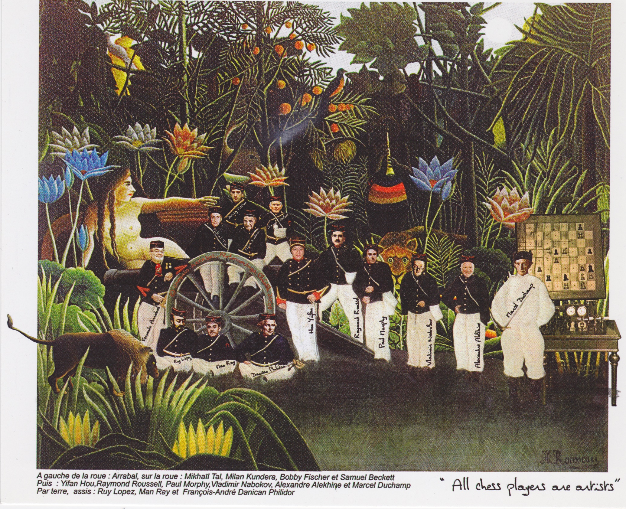 …à gauche de la roue: Fernando Arrabal sur la roue, Mikhaïl Tal, MILAN KUNDERA, Bobby Fischer et SAMUEL BECKETT;